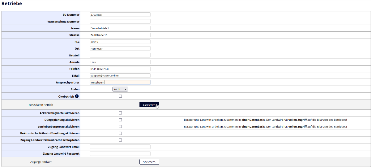 Nach der Auwahl des grünen Plus öffnet sich eine neue Seite unter der du deine Betriebsdaten angeben kannst. Wähle nach der Eingabe der Basisdaten den Button "speichern".